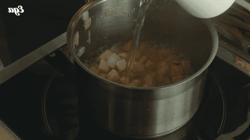 Несколькими порциями влить 100–200 мл бульона, каждый раз давая ему закипеть и впитаться в овощи, чтобы поймать правильную консистенцию — содержимое должно быть чем-то средним между рагу и супом. Тушить овощи в бульоне до мягкости.