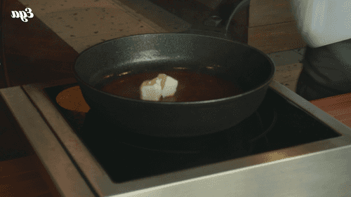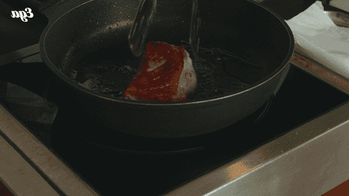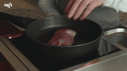 Сковороду поставить на небольшой огонь, кинуть веточку тимьяна и выложить утку кожей вниз.