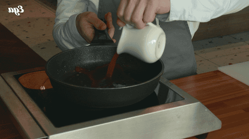 Тем временем приготовить соус. В 500 мл воды развести 50 грамм порошка демигляс, проварить 2 минуты. Затем в ту же сковороду, где жарилась утка, влить получившуюся смесь, хорошенько поскрести лопаткой, собирая все кусочки, прилипшие к сковороде, и выпарить бульон примерно на треть.
