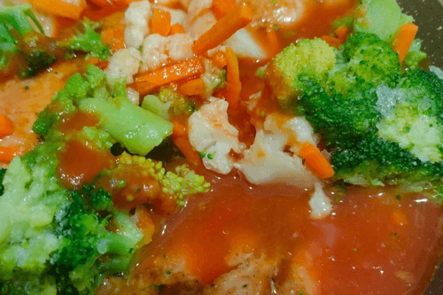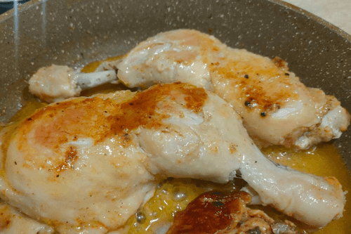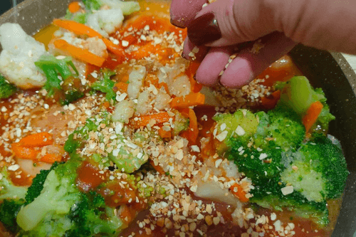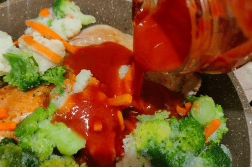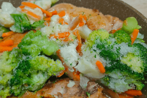 Овощную смесь выложить в сковороду к почти готовой курице.