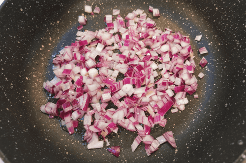 На сковороде разогреть оливковое масло и выложить мелко нарезанный лук. Обжаривать 2–3 минуты на сильном огне, помешивать.