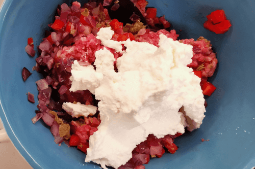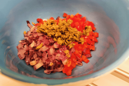 В миску выложить мелконарезанный перец и и измельченные каперсы. Добавить обжаренный лук.