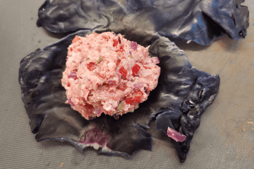 На отварной лист капусты выложить порцию фарша. Свернуть голубцы конвертиком.