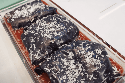 Выложить в форму для запекания голубцы и присыпать тертым пармезаном.
