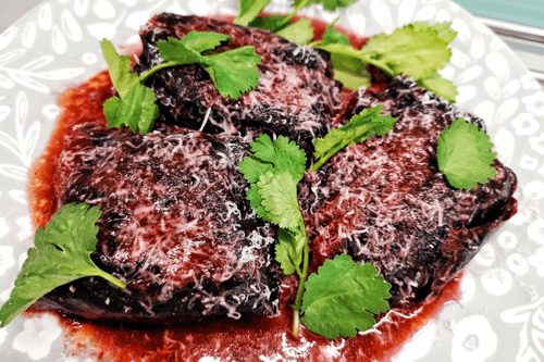 Через 25 минут выложить голубцы на блюдо, присыпать тертым пармезаном. Украсить веточками кинзы и подавать.