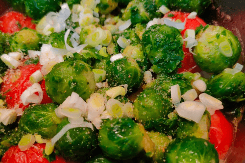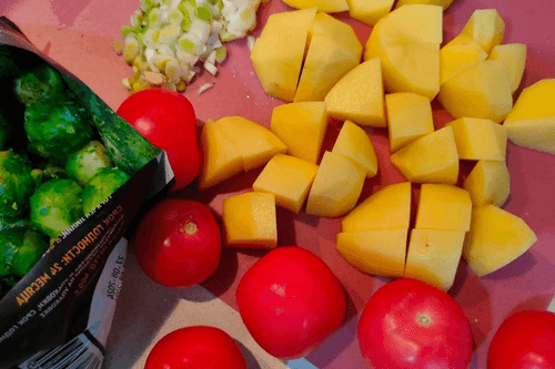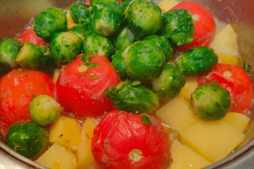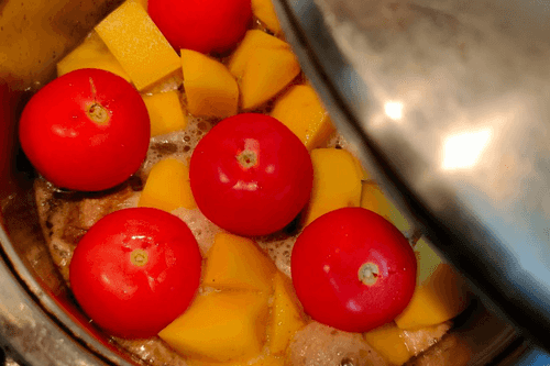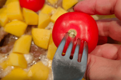 Положить картофель и помидоры (предварительно проколов) к мясу.