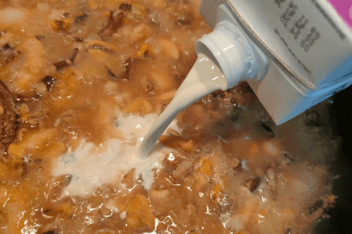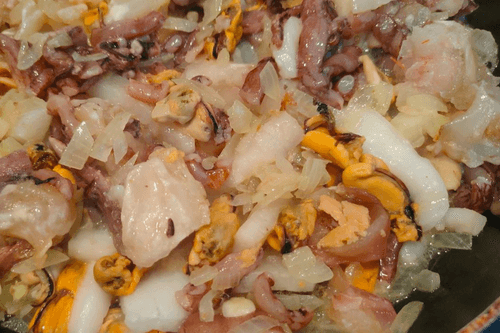 К готовым морепродуктам с луком добавить сливки и протушить вместе около 7 минут.