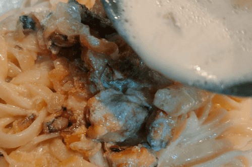 Оставить макароны в кастрюле и к ним выложить морепродукты.