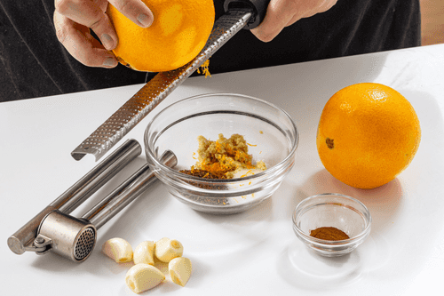 Смешать молотые специи, соль, имбирь, раздавленный через пресс чеснок и апельсиновую цедру до однородной пасты. При необходимости добавить немного растительного масла.