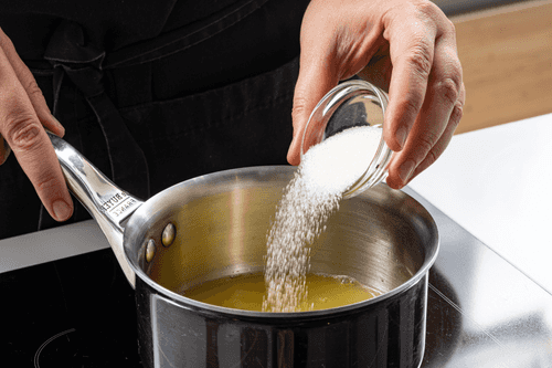 Выдавить из апельсинов сок и уварить его с сахаром вдвое в небольшом сотейнике.