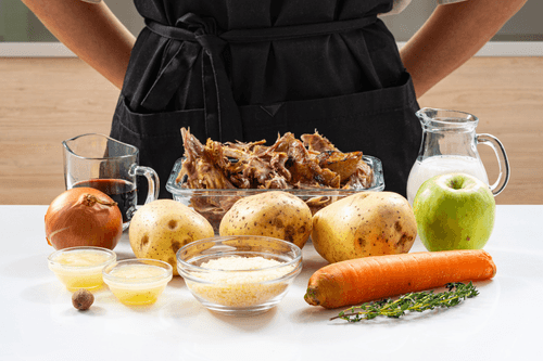 Жила-была утка да на праздничный стол попала. Из ножек получилось конфи, из грудки — салат, а может, и целая птица отлично подрумянилась в духовке. Какова бы ни была птичья судьба, кое-что от нее точно осталось — это каркас с остатками мяса. И вот способ им с умом распорядиться. Пармантье придумали французы, которые, как известно, и крошке за столом не дадут пропасть. Чтобы вытянуть из птичьего мяса и косточек все самое вкусное, к нему при тушении добавляются кисло-сладкие яблоки, овощи и красное вино. А упаковывают утиную начинку в шубку из картофельного пюре. Но если у вас осталась с ночи запеченная или отварная картошка, для пармантье она тоже подойдет.