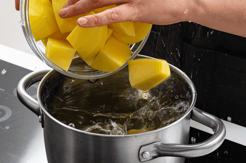 Картофель очистить, нарезать крупными кусочками и отварить до готовности.