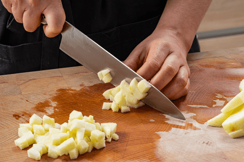 Яблоки очистить от кожуры и семян и нарезать кубиками чуть покрупнее.