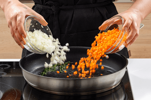 Разогреть в сковороде утиный жир (оставить немного для смазывания формочек), добавить тимьян, обжарить лук и морковь до мягкости и золотистого цвета.