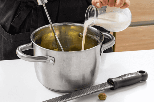Картофель размять в пюре, добавить разогретое молоко, мускатный орех, посолить, поперчить и перемешать.