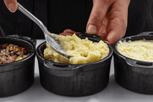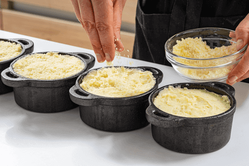 Порционные формочки для запекания смазать утиным жиром, выложить в них слой пюре, затем слой рагу, а после снова пюре.