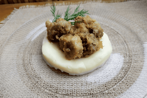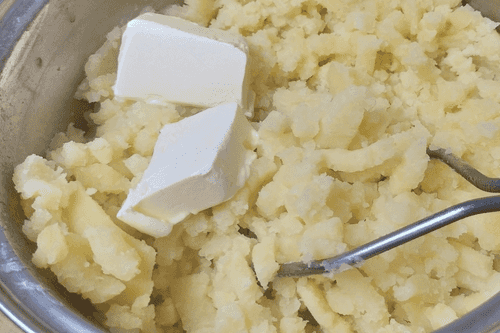 Приготовить картофельное пюре: отварить картофель и растолочь его со сливочным маслом.