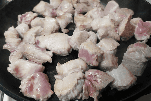 Мясо подрумянить на сильном огне со всех сторон.