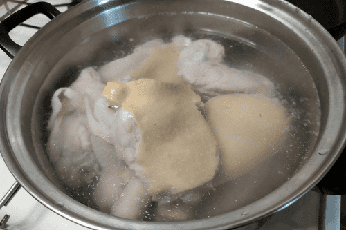 Залить курицу кипятком и варить 40 минут (если курица домашняя, то 1 час). Готовое мясо должно хорошо отходить от кости.