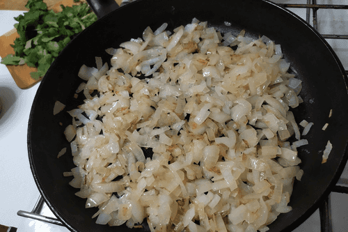 Лук мелко нарезать и обжарить до золотистого цвета.