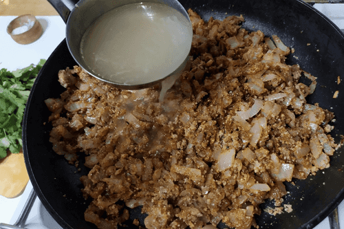 Влить в сковороду 3–4 половника бульона, в котором варилась курица. Тушить 5–7 минут.