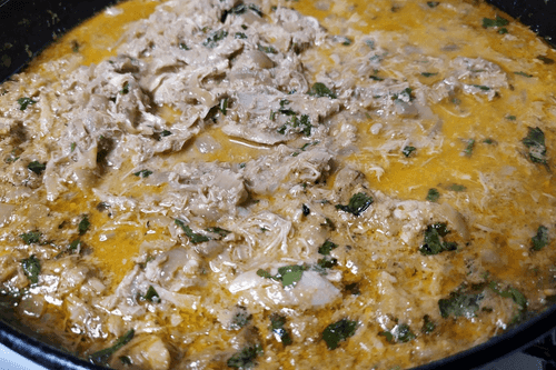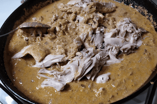 Добавить куриное мясо к ореховому соусу.