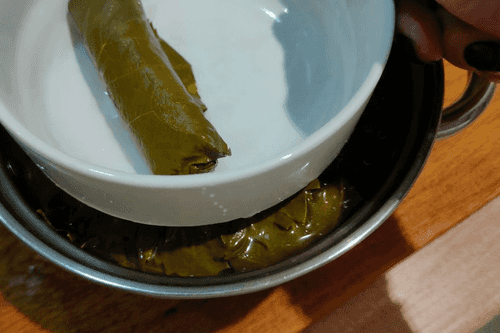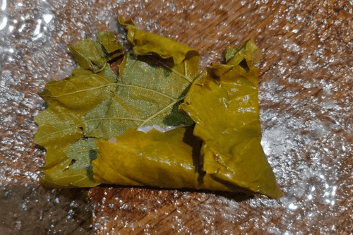 Замочить сверток в горячей воде, чтобы листья развернулись.
