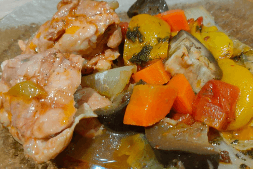 Курица, тушенная с овощами, — это классическое блюдо европейской кухни, сочетающее нежное мясо с богатым ароматом сезонных овощей. Корни этого рецепта уходят в традиционные деревенские кухни, где тушение продуктов позволяло сохранить их сочность и раскрыть вкусовые нюансы. Лук, морковь, баклажаны и сладкий перец создают гармоничное сочетание свежести и сладости, а томатная паста придает легкую кислинку и насыщенный цвет. Листья пекинской капусты служат естественным «покрывалом», помогая сохранить сочность ингредиентов. Блюдо идеально подходит для семейного ужина, хорошо сочетается с зеленью и свежим хлебом. Оно питательное, согревающее и оставляющее после себя уютное ощущение домашнего тепла.