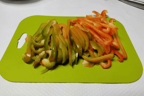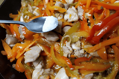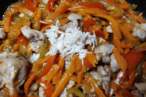 Добавить болгарский перец. Все перемешать и тушить 10–15 минут, пока овощи не станут мягкими.