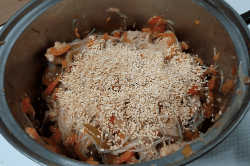 Семена кунжута слегка обжарить на сухой сковороде 1–2 минуты, постоянно помешивая, чтобы семена не подгорели.