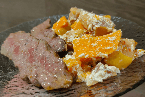 Говядина с гарниром из тыквы и айвы — изысканное блюдо европейской кухни, которое сочетает в себе насыщенный вкус мяса с нежной сладостью тыквы и освежающей кислинкой айвы. Это кулинарное творение отражает традиции гастрономии, где гармоничное объединение вкусов создает утонченное наслаждение. Тыква, придающая мягкость и сливочную текстуру, аккуратно тушится вместе с айвой, напитываясь ее ароматом. Говяжьи стейки, обжаренные на топленом масле, приобретают сочность и насыщенный вкус, который подчеркнут специями и нежным оттенком сливок. Блюдо идеально подходит для торжественного ужина или уютного семейного обеда, даря тепло и наслаждение каждому, кто его попробует. Сочетание сладости овощей и пикантности мяса делает его поистине незабываемым.