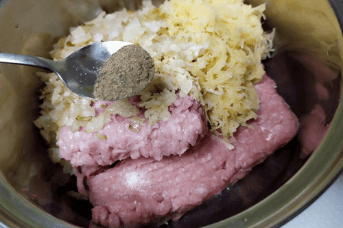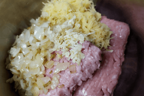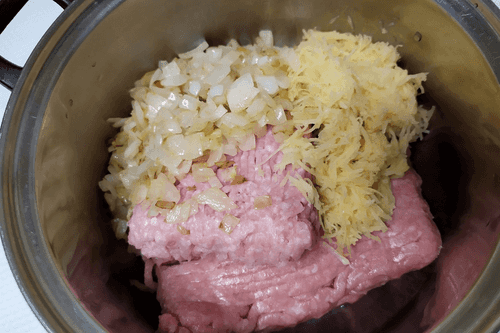 Картофель сырой натереть на мелкой терке и добавить к фаршу.