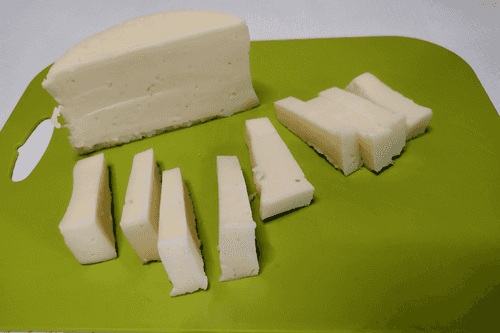 Твердый сыр нарезать брусочками.