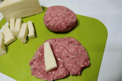 Сформировать из фарша зразы, вложив внутрь каждой кусочек сыра.