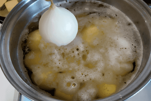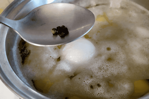 Слить воду с картофеля, убрать луковицу и горошины перца.