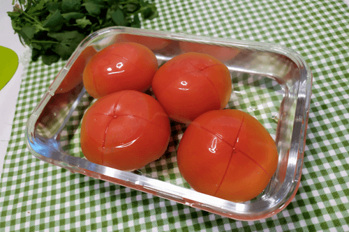 Помидоры залить кипятком на несколько минут.