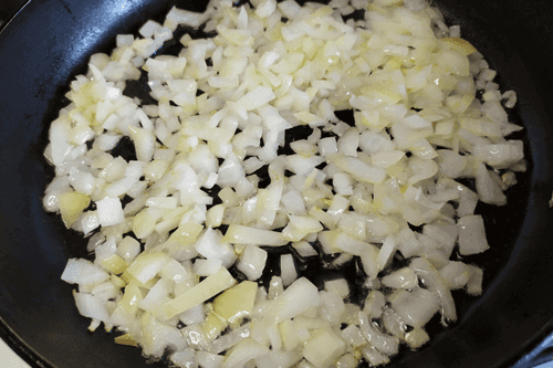 Мелконарезанный репчатый лук обжарить на сковороде до золотистого цвета.