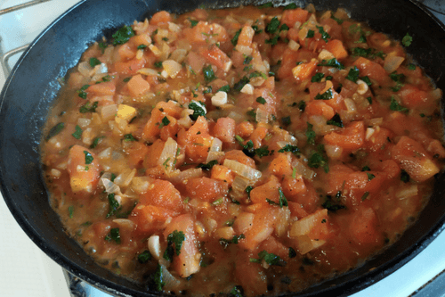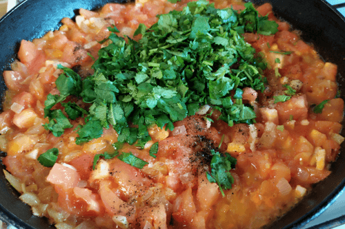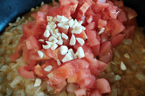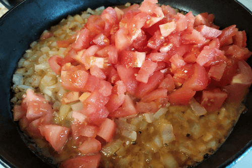 Добавить в сковороду нарезанные помидоры.