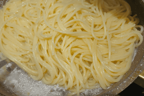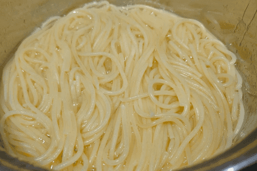 В кипящую соленую воду с маслом поставить спагетти, они сами осядут.
