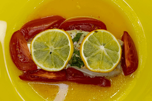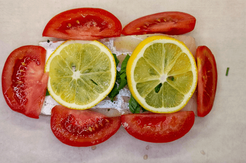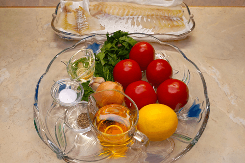 Треску посыпать петрушкой, сверху положить лимоны, а вокруг нарезанные томаты.