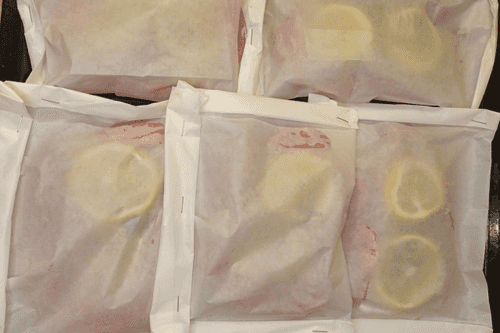 Вынуть из духовки, разрезать конверты, переложить на тарелки, подать.