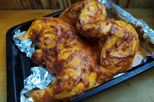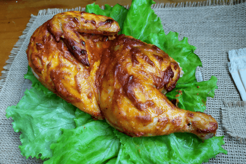 Запекать в духовке при температуре 200 градусов в течение 40–60 минут (зависит от веса курицы) до румяной корочки.