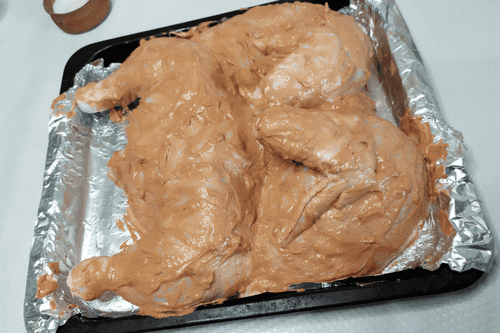 Застелить противень фольгой, поместить на него тушку, промазать соусом со всех сторон. Оставить в холодильнике на пару часов, чтобы мясо хорошо промариновалось.