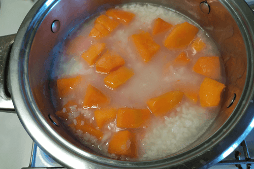 После закипания воды добавить к рису нарезанную тыкву и уменьшить огонь до минимума. Накрыть крышкой и готовить до мягкости риса и тыквы, пока не выпарится почти вся жидкость.