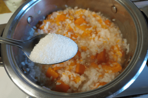 Когда рис будет практически готов, добавить к нему сахар по вкусу.
