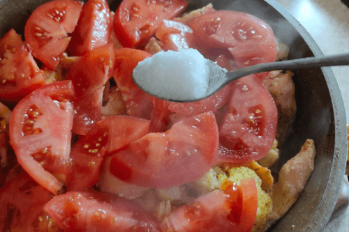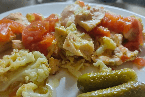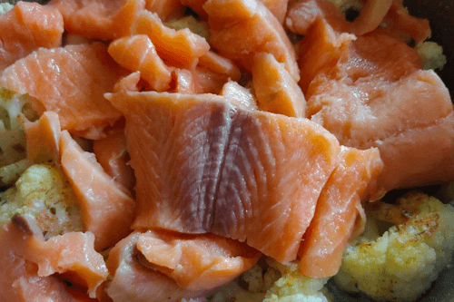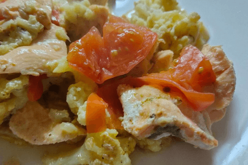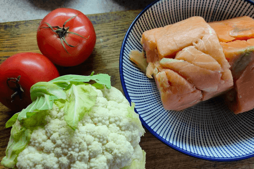 Семга с цветной капустой и помидорами