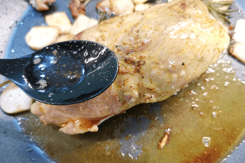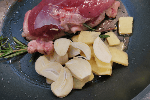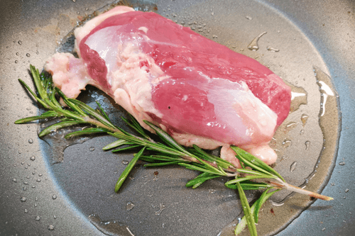На сухую раскаленную сковороду выложить грудку кожей вниз. Как только вытопится жир, добавить в него веточку розмарина.