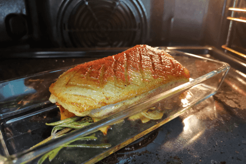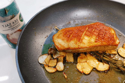 Как только кожа хорошенько подрумянится, перевернуть и посолить. Убавить огонь. Обжаривать еще около 2–3 минут.