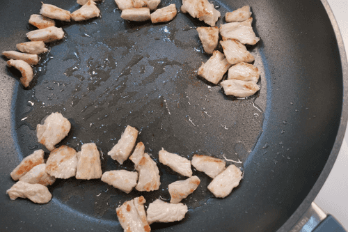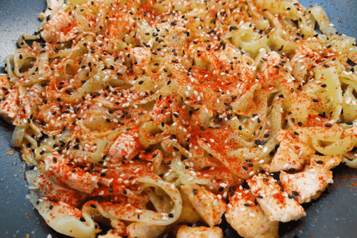 Приправить перцем чили. Обжаривать около 3 минут, периодически помешивая.