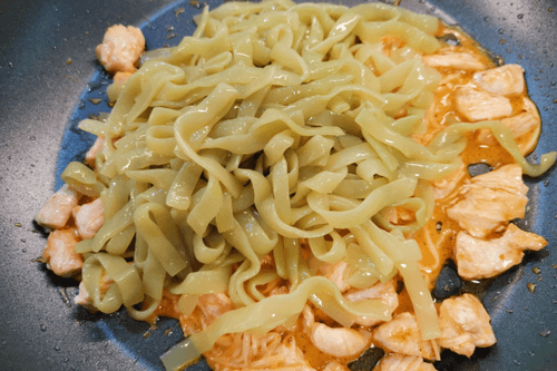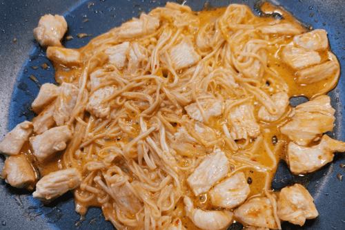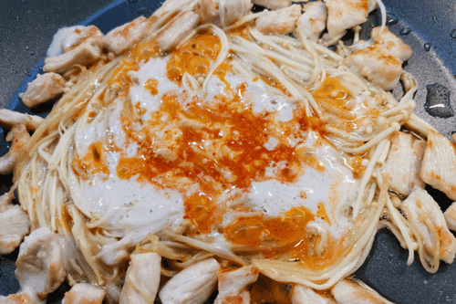Через 2 минуты добавить кокосовые сливки и соус кимчи.